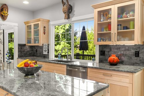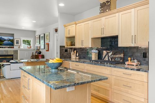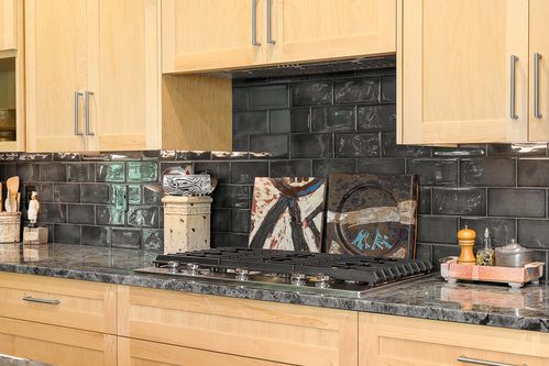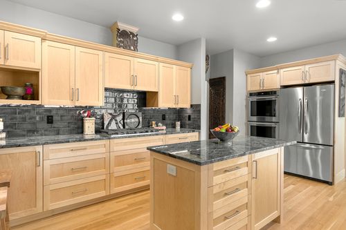 This kitchen remodel started as a result of a water leak upstairs. Many of the old cabinets had to be removed, which started a domino effect of what would stay and what had to be replaced. In the end, this served as the perfect time for the owners to start fresh and reconfigure the kitchen to a layout that better suited them. New maple cabinets with a clear finish fill the room, with beautiful Aphrodite Royal granite countertops and glossy black subway tile backsplash.