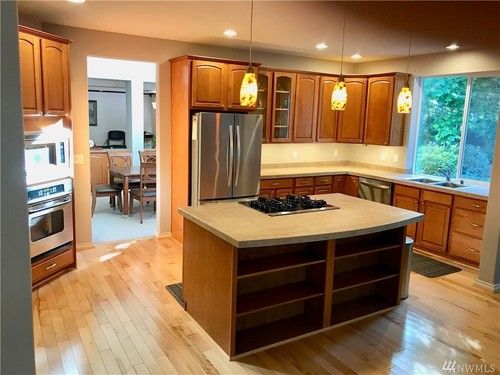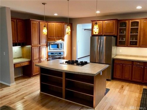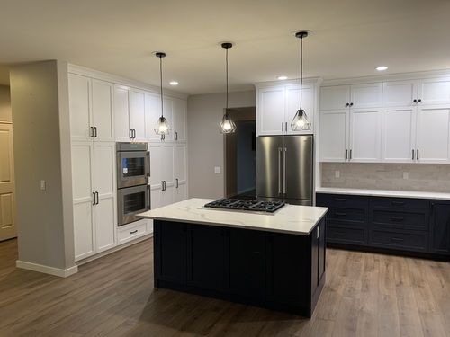 The owners were ready for a change from their 30 year old kitchen. We made a slight modification to the layout by squaring off the angled wall that was behind the old double oven and increasing the storage on that wall. The kitchen received new, 2 tone cabinets with quartz counters. The flooring was also changed throughout the main floor of the house to give it a completely new look.