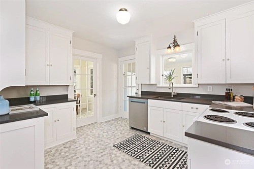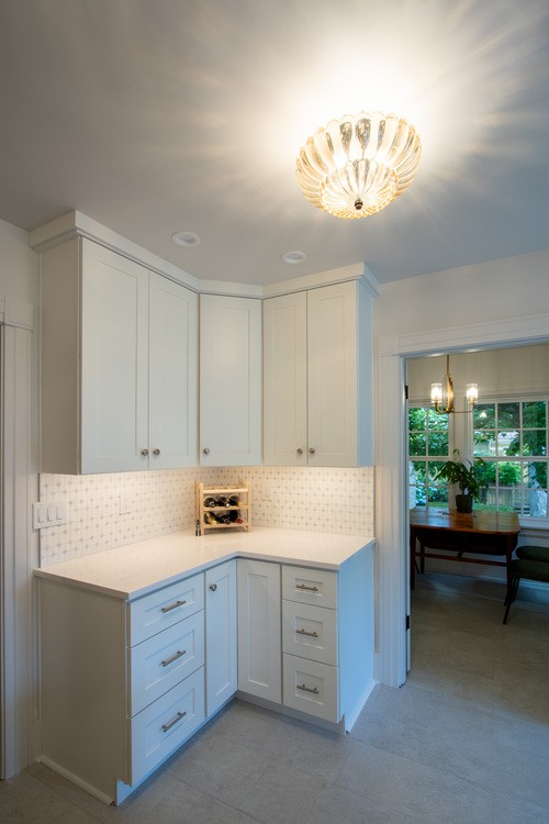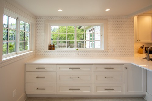 Our team reimagined the layout by relocating the laundry area and removing the dividing wall, creating a kitchen that feels open, bright, and seamlessly connected to the rest of the house. High-quality finishes were carefully selected for both durability and design: a resilient tile floor that stands up to Pacific Northwest weather, a full-height tile backsplash that honors the home’s original character, and a touch of the homeowner’s favorite shade of blue for a personalized accent. With generous counter space, abundant storage, and a timeless aesthetic, the result is a kitchen crafted for both everyday living and years of enjoyment.