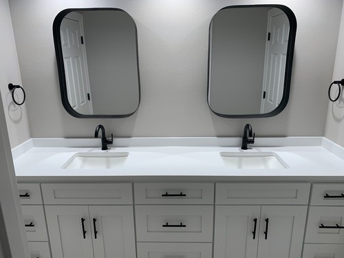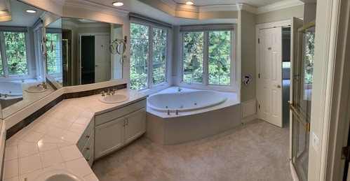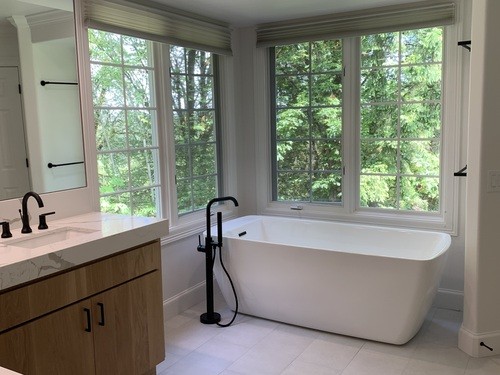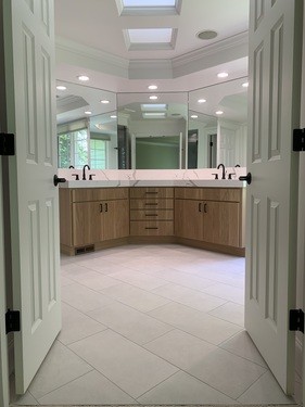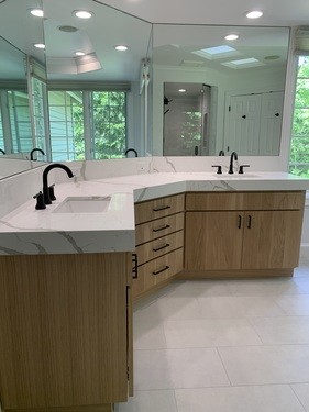 The primary bathroom was the largest of the 3 which involved removing the jetted tub and converting the space to a free-standing tub. The cabinets remained and were veneered with white oak. New quartz counters were installed with a built-up edge and backsplash. New tile floor and shower stall completed the transformation.
