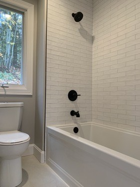 The 2 smaller bathrooms received new tubs & fixtures, white cabinets with quartz tops and subway style tub surrounds.